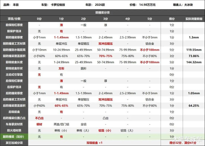 2026款丰田卡罗拉锐放防撞梁评分