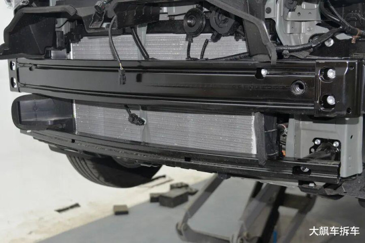 拆掉这辆车的前保障杠,看到里面有一根双层辊压钢板防撞梁,厚度为1.30毫米,能灭绝车头的73.86%,和锋兰达基本相等,比RAV4荣放的单层防撞梁要好。