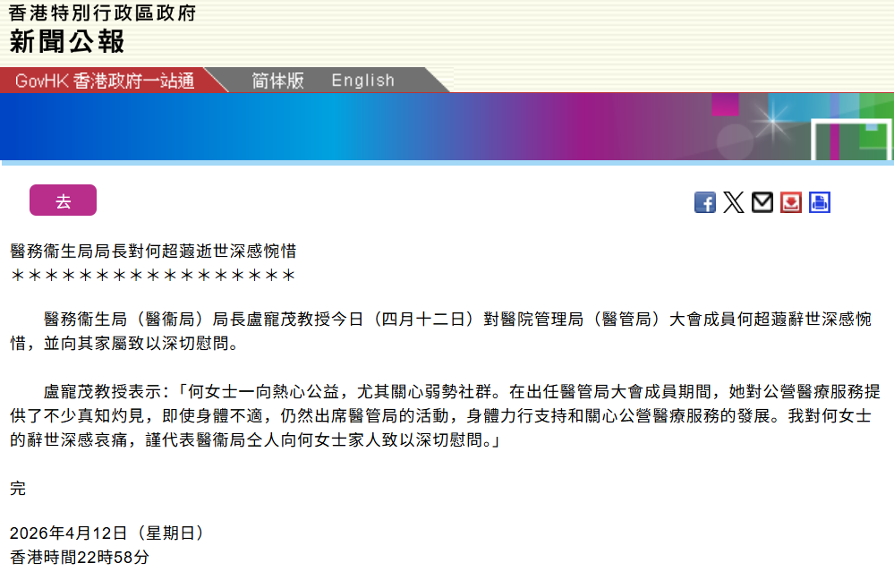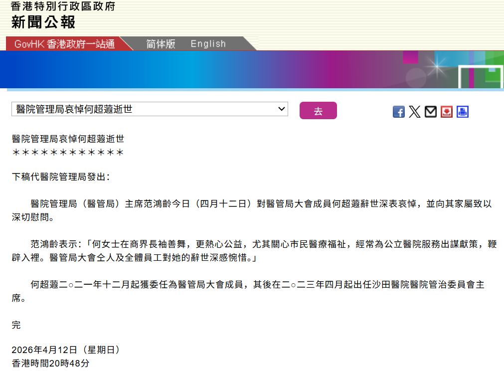 昨天(4月12日)晚上,香港特区政府医务卫生局(以下简称“香港医卫局”)和香港病院料理局(以下简称“香港医管局”)讲求东说念主分离对何超蕸离世暗示吊祭。