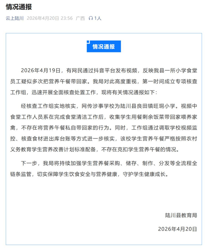 4月19日,网民发视频称广西陆川一小学的食堂职工疑似屡次把养分午餐带回家。20日事发学校校长告诉记者,已接到关联反应,该职工未必拿的是学生吃剩的饭菜回家,至于有莫得拿新的养分午餐等物品,还在造访中。