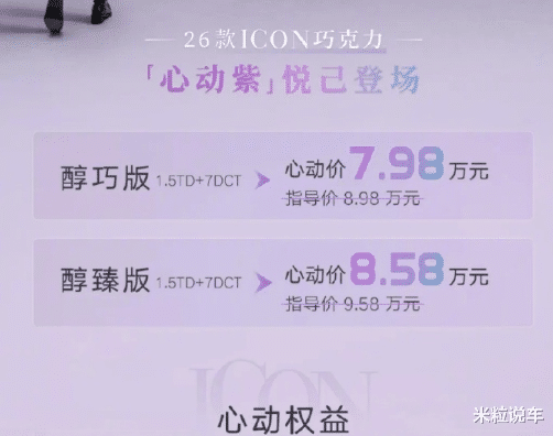 近期祯祥ICON巧克力心动紫厚爱迎来了上市。从定名方法咱们就得回谜底,这次紫色的外不雅是该新车最大的亮点场合,厂家谄媚价8.98-9.58万元,限时给出了7.98万的起售价,何况紫色外不雅可以免费选装。