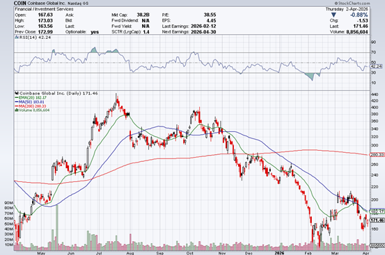 COIN面前股价约171好意思元(截止2026年4月2日收盘),市值约382亿好意思元,市盈率(P/E)约38.6倍(基于面前EPS 4.45好意思元)。