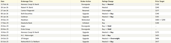 参加2026年,跟着Q4功绩出炉和加密阛阓诊疗,机构评级出现显着分化:Monness Crespi & Hardt将计划价下调至120好意思元,成为最悲不雅的声息;而Cantor Fitzgerald和高盛、好意思银则在1月底依然督察增持/买入评级,计划价在277-340好意思元区间。