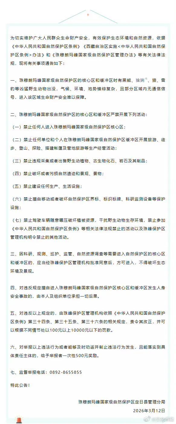 微博账号“文化西藏”转发的《对于退却在珠穆朗玛峰国度级天然保护区定日县处分区域的中枢区和善冲区开展登山、徒步、旅游探险等步履的书记》泄漏: