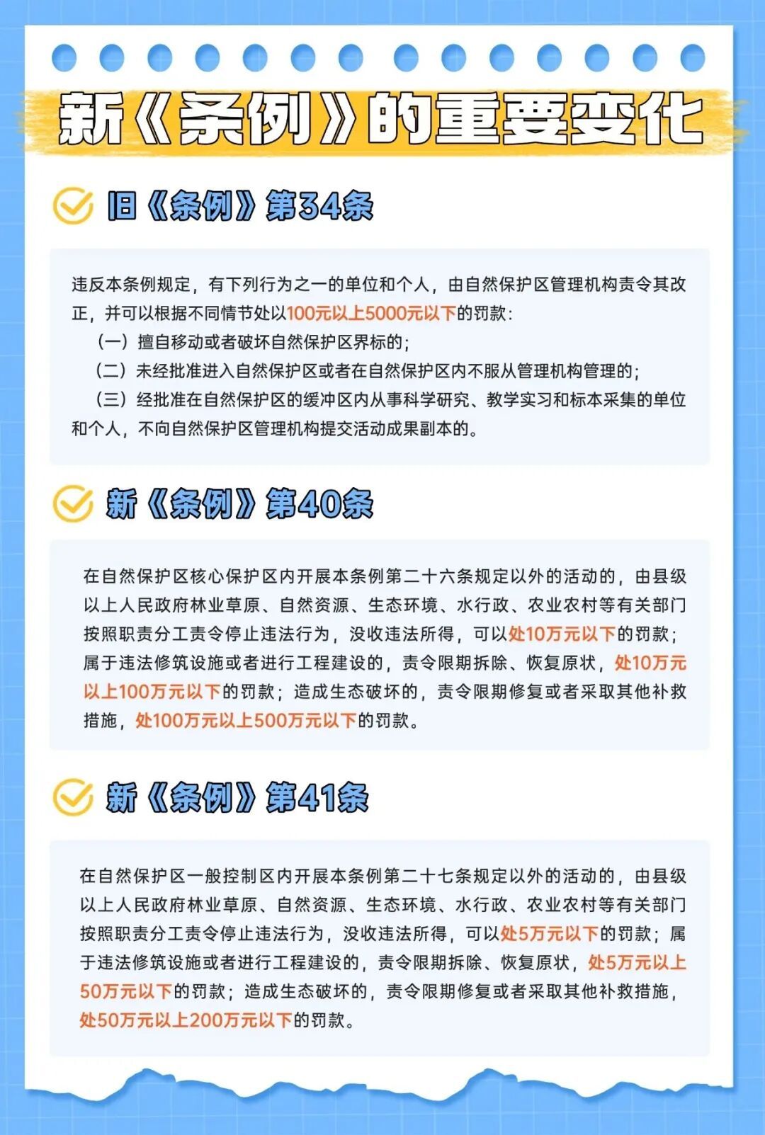 同期,新《条例》大幅提高了对非法进入保护区、遏制生态环境等四肢的惩处力度。针对遏制界标四肢(损毁、涂改、讳饰、私自打消、移动),罚金上限从5000元提高至2万元;在中枢保护区内开展司法除外的步履,处10万元以下罚金;在一般收敛区内开展司法除外的步履,处5万元以下罚金。